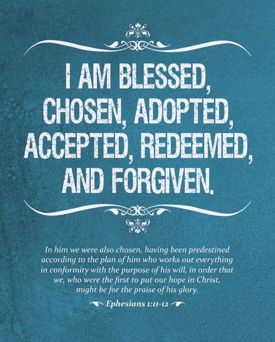 Blessed be the God and Father of our Lord Jesus Christ, who has blessed us with every spiritual blessing in the heavenly places in Christ, just as He chose us in Him before the foundation of the world, that we should be holy and without blame before Him in love,having predestined us to adoption as sons by Jesus Christ to Himself, according to the good pleasure of His will, to the praise of the glory of His grace, by which He made us accepted in the Beloved.