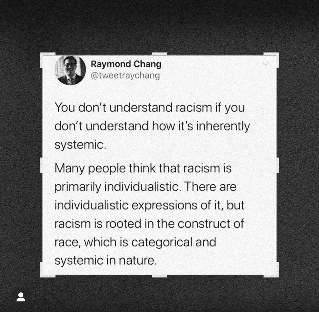 I was at an art museum with a lady once and there was a painting of a somber black man. She mocked him, “Oh the plight of the black man.” She also later remarked how so many minorities starting coming to her church and now it wasn’t like her church anymore. She saw no issue with making these statements, yet they were manifestations of her being taught racism.
